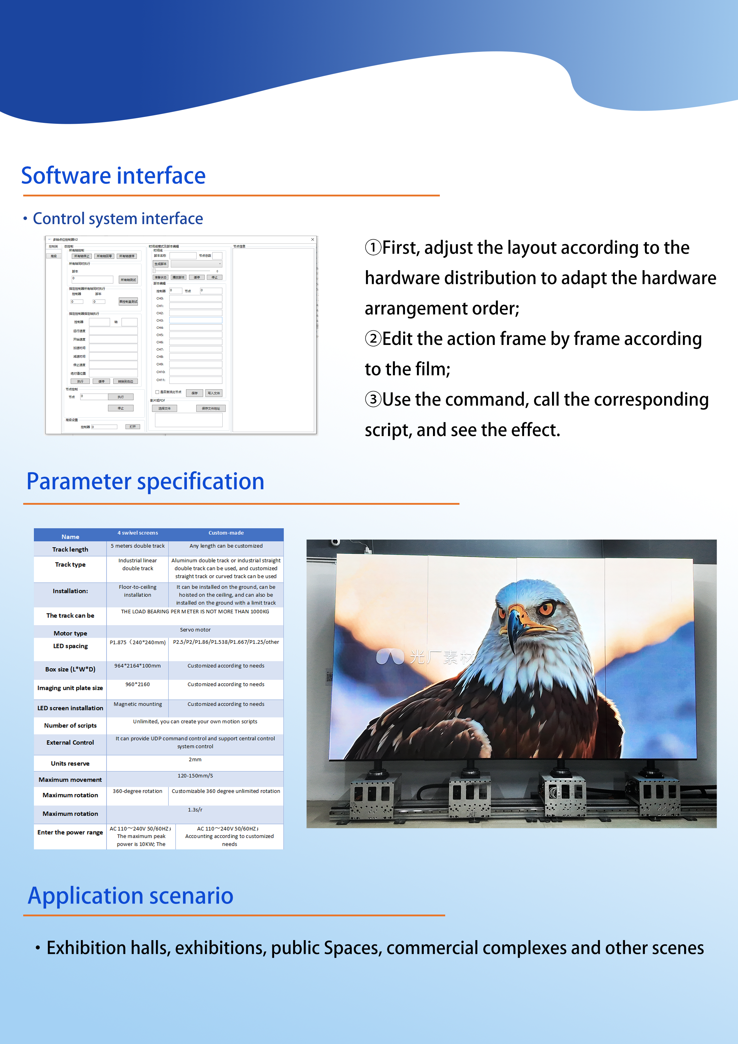 Modular design, each module is composed of multiple sliding display units, easy installation, simple maintenance can be removed and replaced by the whole module, can also be removed and replaced by a single unit. Display carrier is not limited, can be combined with LED screen, LCD splicing screen, LCD display, projector and other display carrier diversified creativity;